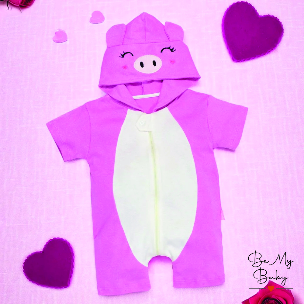 Macacão Temático Curto com Capuz Bordado e Abertura em Ziper - Porquinha